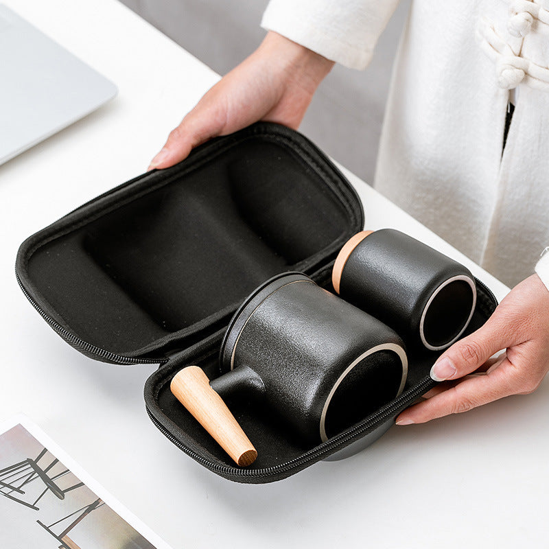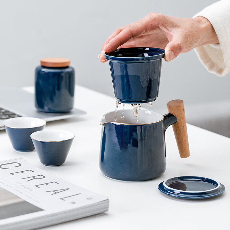 Ceramic Travel Tea Set with Infuser and Wooden Handle Teapot