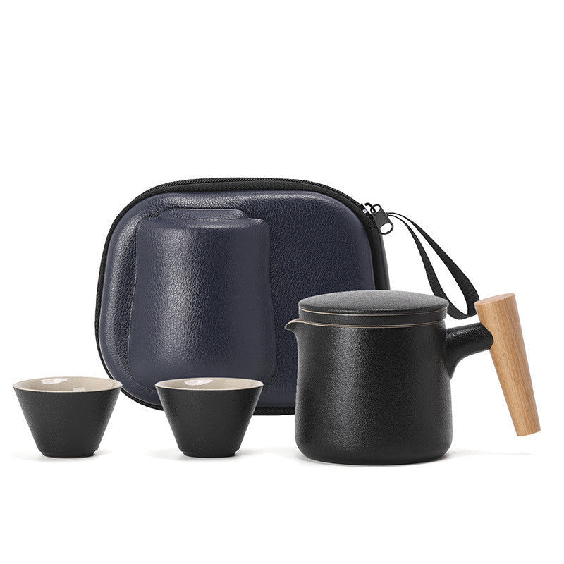 A compact tea set designed for clean and practical brewing. The ceramic infuser nests on the pot for easy steeping; the smooth spout pours neatly into the two matching cups. The wooden handle offers a comfortable grip, while the zip carry case protects the set in your bag or suitcase. Ideal for office breaks, home use, or travel.